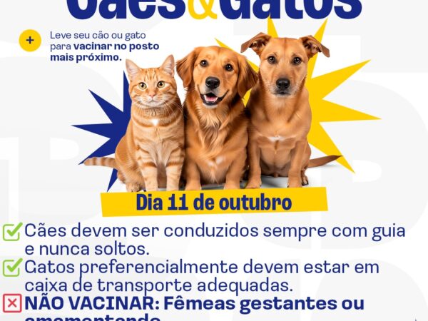 06 outubro 2025 PORANGATU REALIZA CAMPANHA DE VACINAÇÃO ANTIRRÁBICA NESTE SÁBADO, 11 DE OUTUBRO A Prefeitura de Porangatu, por meio da Secretaria Municipal de Saúde, realiza neste sábado, 11 de outubro, a Campanha de Vacinação Antirrábica em Cães e Gatos. A ação tem como objetivo proteger os animais e a população contra a raiva, uma doença grave que pode ser transmitida aos seres humanos. Ao todo, serão 15 postos de vacinação distribuídos em diferentes regiões do município, incluindo escolas, unidades de saúde e o Centro de Bem-Estar Animal, garantindo mais facilidade de acesso à população. A vacinação é gratuita e destinada a cães e gatos saudáveis a partir dos 3 meses de idade. A secretária municipal de Saúde reforça a importância da participação da comunidade. “A vacinação antirrábica é um ato de responsabilidade e amor pelos animais. Vacinar é a forma mais eficaz de prevenir a raiva e manter nossa cidade protegida”, destacou. DICAS IMPORTANTES: Durante o dia da campanha, os tutores devem levar seus cães com coleira e guia, e os gatos, em caixas de transporte adequadas. Não devem ser vacinadas fêmeas gestantes ou em amamentação, e crianças não podem levar os animais sozinhas. O Governo de Porangatu convida toda a população a participar e garantir a imunização dos seus pets. Data: 11 de outubro (sábado)Local: Postos de vacinação em toda a cidadeRealização: Secretaria Municipal de Saúde – Governo de Porangatu, Gestão 2025–2028 | Novos Tempos Confira os locais de vacinação abaixo: Ler Notícia